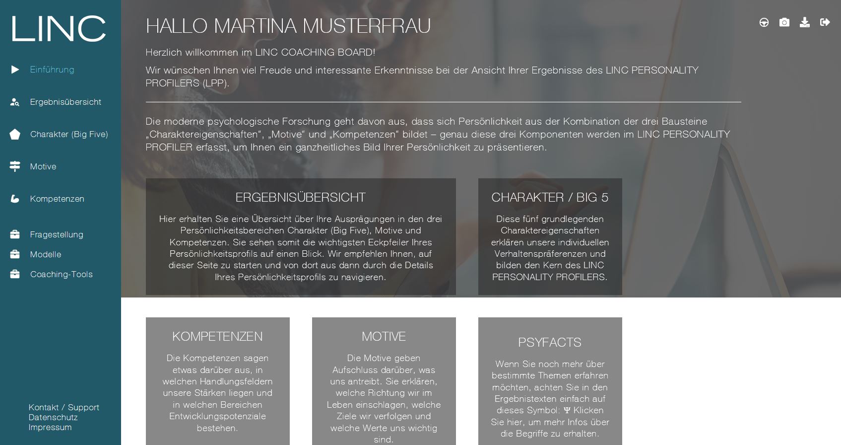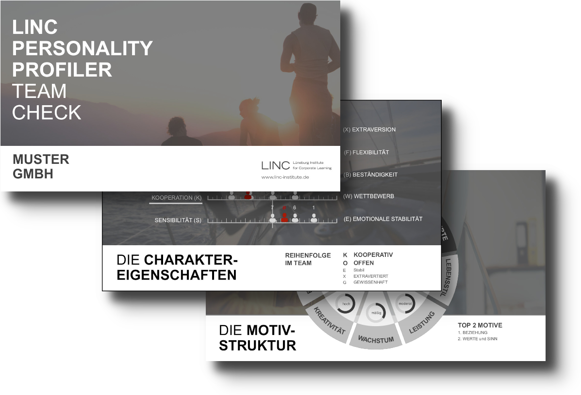 Als Grundlage für meine persönlichkeitsorientierten Coachings und Trainings nutze ich den Persönlichkeitstest von LINC - umgesetzt nach neuesten psychologischen Standards und technischen Möglichkeiten.